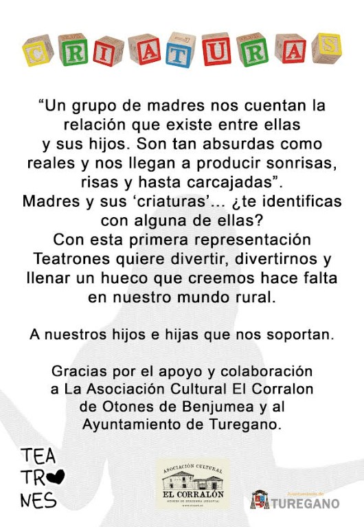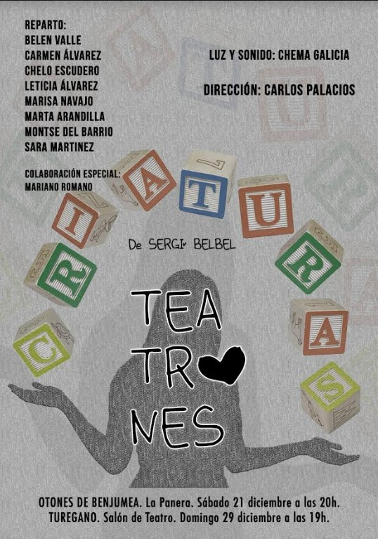 El 21 de diciembre de 2019 se estrena la primera obra de Teatrones en el local de La Panera de la Asociación en Otones: “Criaturas” una adaptación libre de textos teatrales de Sergi Belbel. Unos días después, el 29 de diciembre, se representa de nuevo la obra en la cercana localidad de Turégano, en el Teatro del Ayuntamiento. Éxito contundente e incontestable ya que, para sorpresa del grupo hubo que realizar doble función en la misma tarde debido a la cantidad de público asistente que abarrotaba el teatro y doblaba el aforo del teatro.